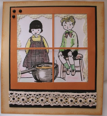 I sponged the craft base card with the Tea Dye ink, and mounted it up - still I was not really happy, then I remembered the black half pearls that I had bought to 'challenge' myself - so popped some on the lace and the top left corner and I was done!