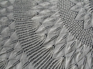 Here is the shawl in all it's glory - laid out on a dark blue sheet. It was knitted in what we know as three ply wool - for those familiar with threads, it is similar in weight to two strands of pearle 5 thread. I knitted it on size 3.25mm needles (size 3 US). For those who are really interested in statistics, I cast off 1,848 stitches...... after six months of knitting.