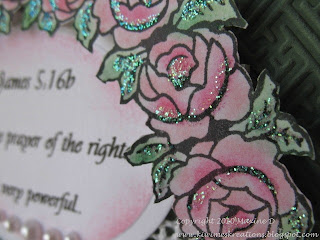 I surrounded it with a half wreath of roses from the Layers of Color set Vintage Roses - stamped in black ink and then coloured with chalks and added some Kindy Glitz for a wee bit of sparkle, and mounted this on dimensionals.