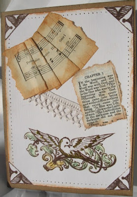 The music is from a hymnal, a purchase from a local secondhand shop, and I sponged the edges with Tea Stain distressing Ink, and pleated it onto the corner of the card.