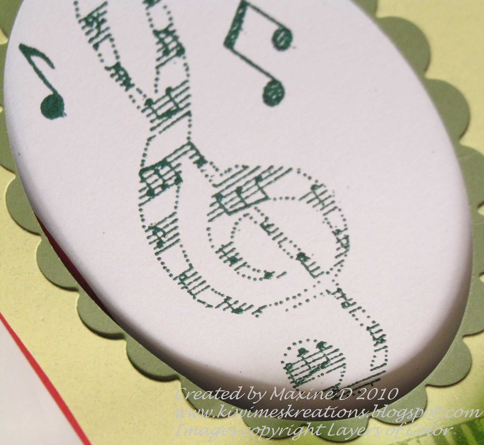 The friends are a very musical family which did affect my choice of stamp - the images are from the Layers of Color set Joyful Noise. I also wanted to use a technique that I saw on Stamp TV that is called "Reverse Nestabilities", which gives dimension to a project, and potentially uses off-cuts from other projects.
