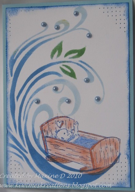 The crib stamp is one from my daughters stash, but it is unmarked. The full stamp has a star suspended over the crib, but I masked that part of the stamp for this card. The crib was coloured with chalks and blender pen.