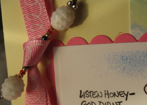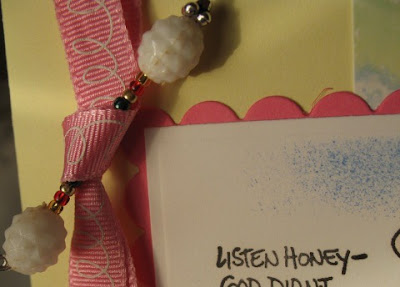 The fawn coloured panel to the left was embossed using the cuttlebug Oriental Weave folder, the edges sponged with Tim Holtz Tea Stain distress ink, and then some cream ribbon was wound around the card. The same ribbon was used to create the three wee features on the right of the main panel.