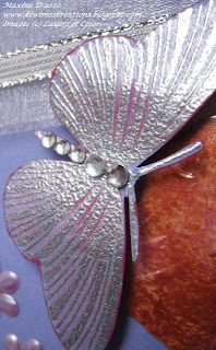 As I wanted to send this card to a friend who is not well, I found one of my very first stamps and stamped it at the base of the flower in black ink to let her know I was 'thinking of her', and pearls added to the corners for an added emphasis.