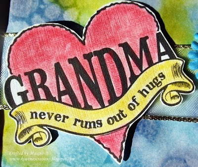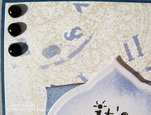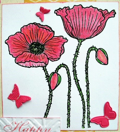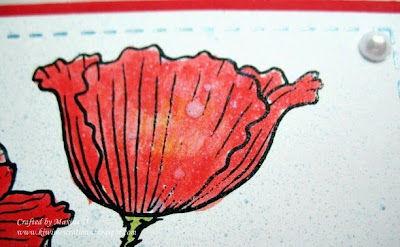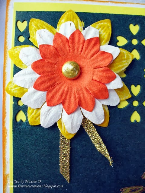 The flowers I gathered from assorted sets, the base one was coloured with ink, and the brad was overlaid with gold liquid pearls. The finishing detail was a wee snippet of gold ribbon peeping from under the flowers.